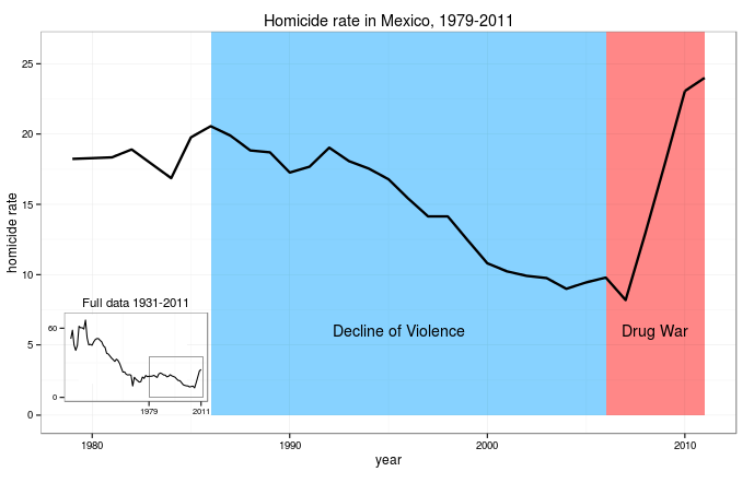 I love this plot because it tells you an important thing very clearly: Holy shit! The war on drugs has been a bad idea for Mexico. I think that this is a fine example of a graph that does the job of communicating a headline observation. Andrew Gelman has interesting things to say about data visualizations (here and here) and how graphs vary in relation to variation in purpose. Some authors may require a differing effect, and produce graphs that work more as puzzles.