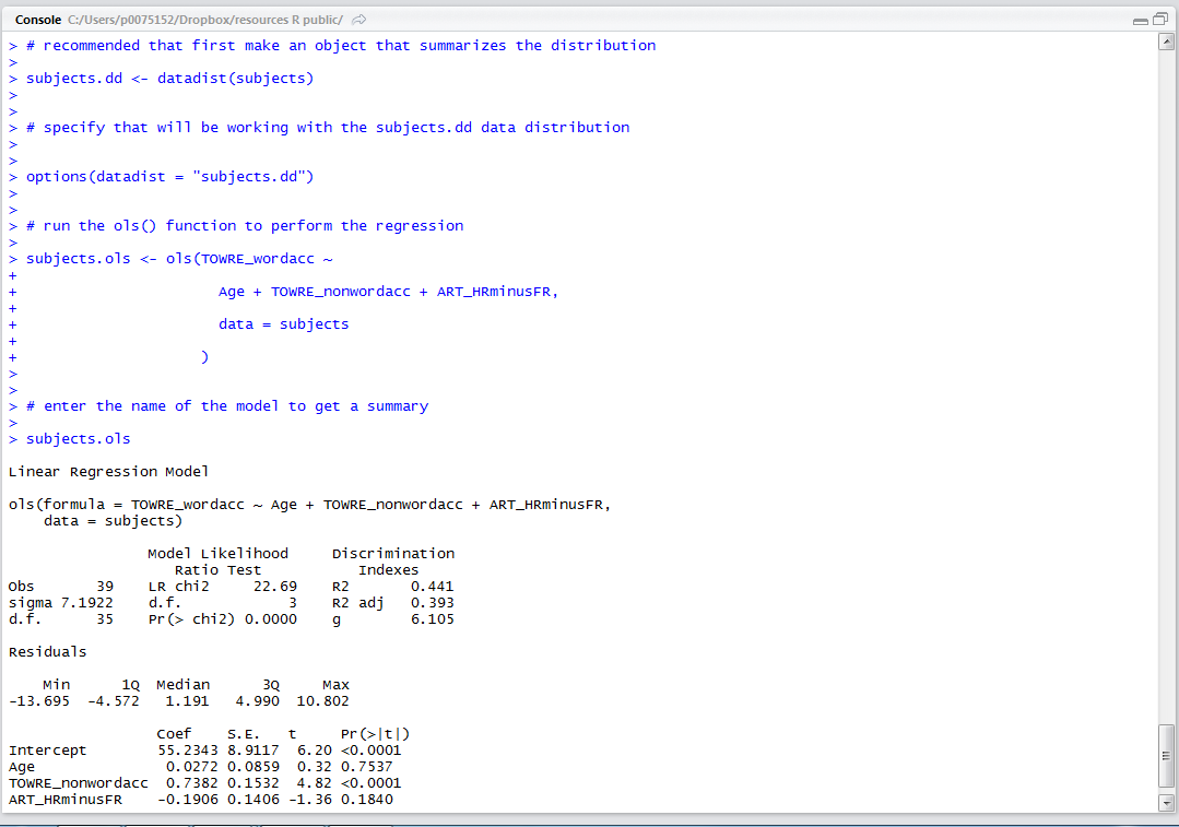 # recommended that first make an object that summarizes the distribution subjects.dd <- datadist(subjects) # specify that will be working with the subjects.dd data distribution options(datadist = "subjects.dd") # run the ols() function to perform the regression subjects.ols <- ols(TOWRE_wordacc ~ Age + TOWRE_nonwordacc + ART_HRminusFR, data = subjects ) # enter the name of the model to get a summary subjects.ols