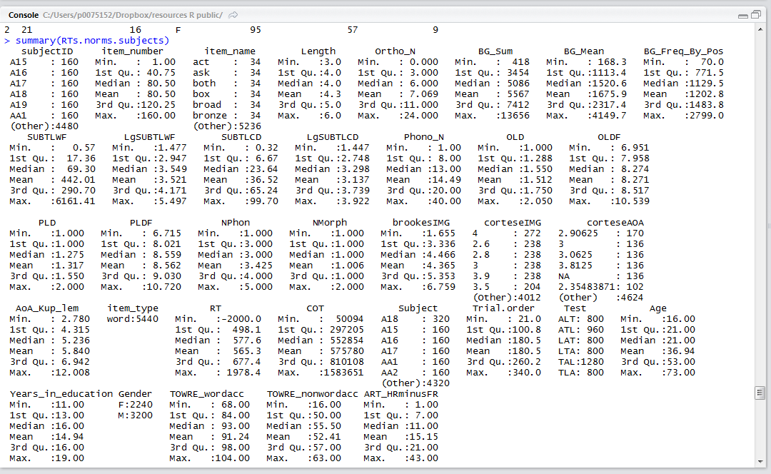 # inspect the dataframe head(RTs.norms.subjects, n = 2) summary(RTs.norms.subjects) describe(RTs.norms.subjects) str(RTs.norms.subjects) length(RTs.norms.subjects) length(RTs.norms.subjects$item_name) levels(RTs.norms.subjects$item_name)