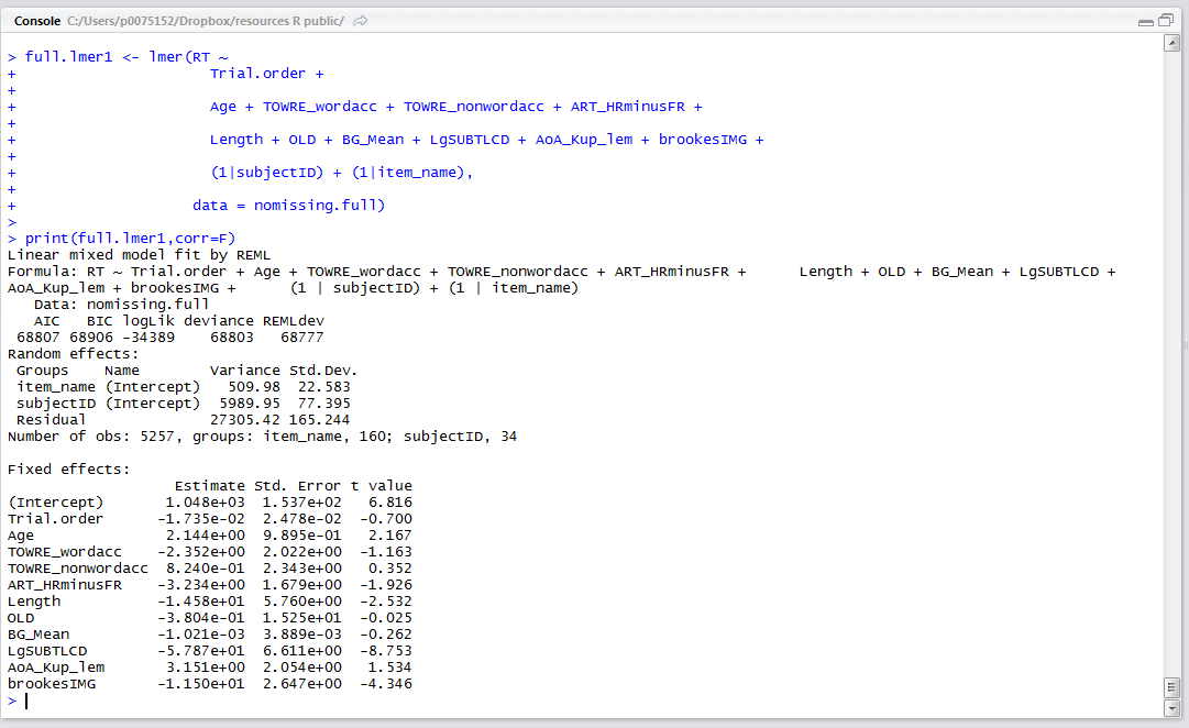 full.lmer1 <- lmer(RT ~ Trial.order + Age + TOWRE_wordacc + TOWRE_nonwordacc + ART_HRminusFR + Length + OLD + BG_Mean + LgSUBTLCD + AoA_Kup_lem + brookesIMG + (1|subjectID) + (1|item_name), data = nomissing.full) print(full.lmer1,corr=F)